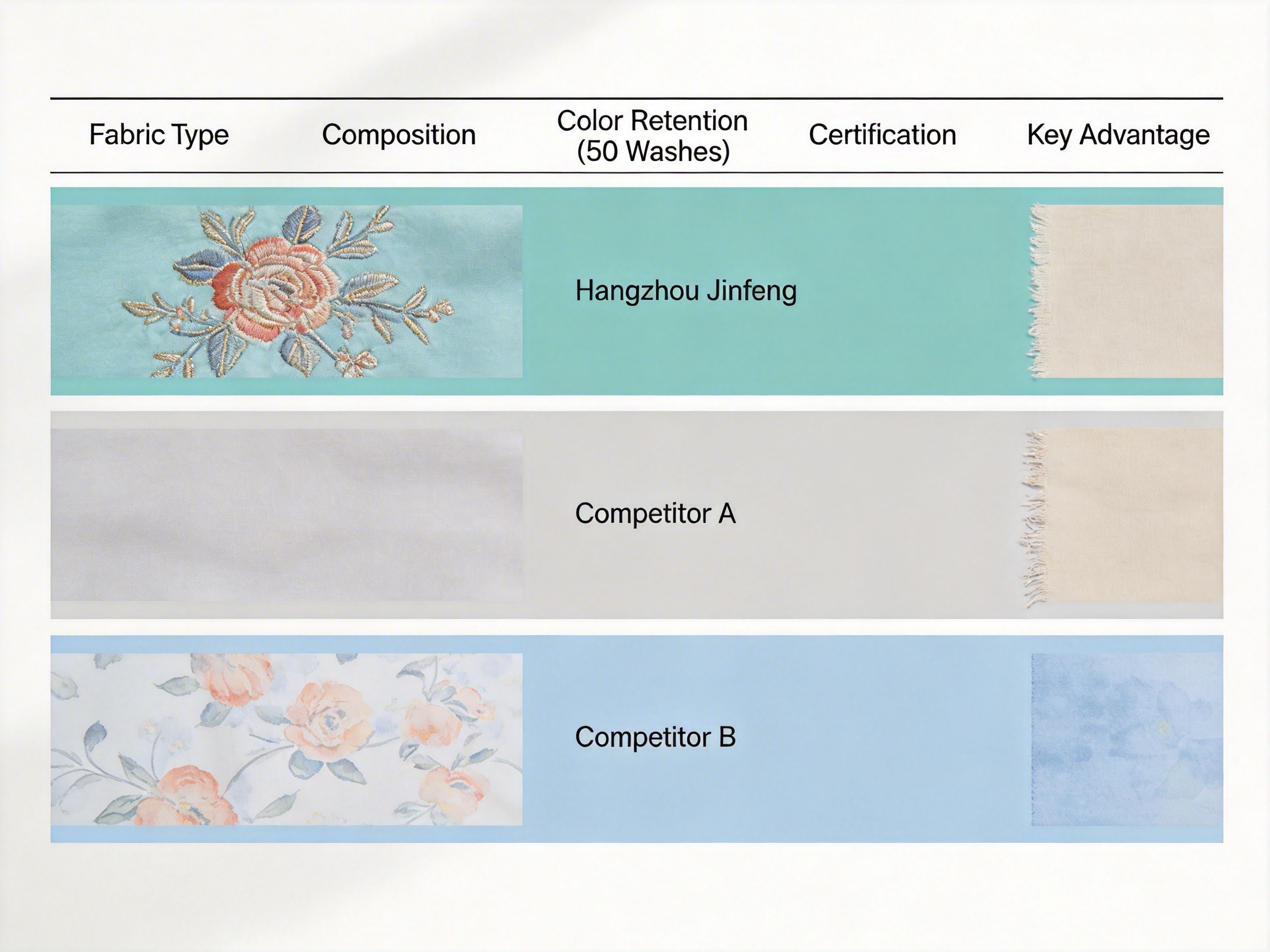 | Pure Cotton Jacquard (Competitor A) | 100% Cotton | 220 | 60% color retention after 50 washes | Our fabric has 4-way stretch; no shrinkage | None |