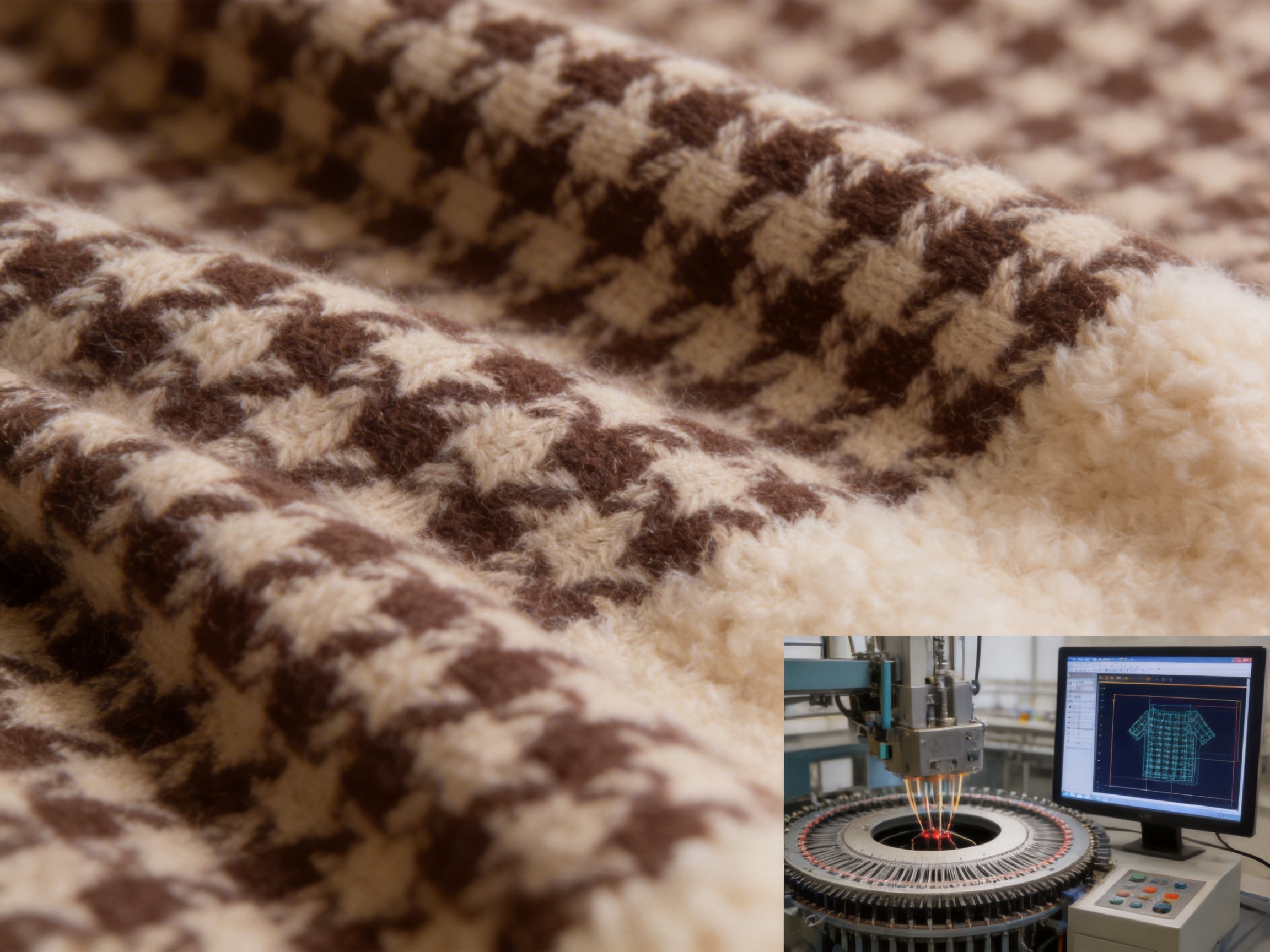 - Digital Design: The houndstooth pattern is created using CAD (Computer-Aided Design) software, with exact measurements for the checks and tonal contrasts. This digital file is then uploaded to the knitting machine.