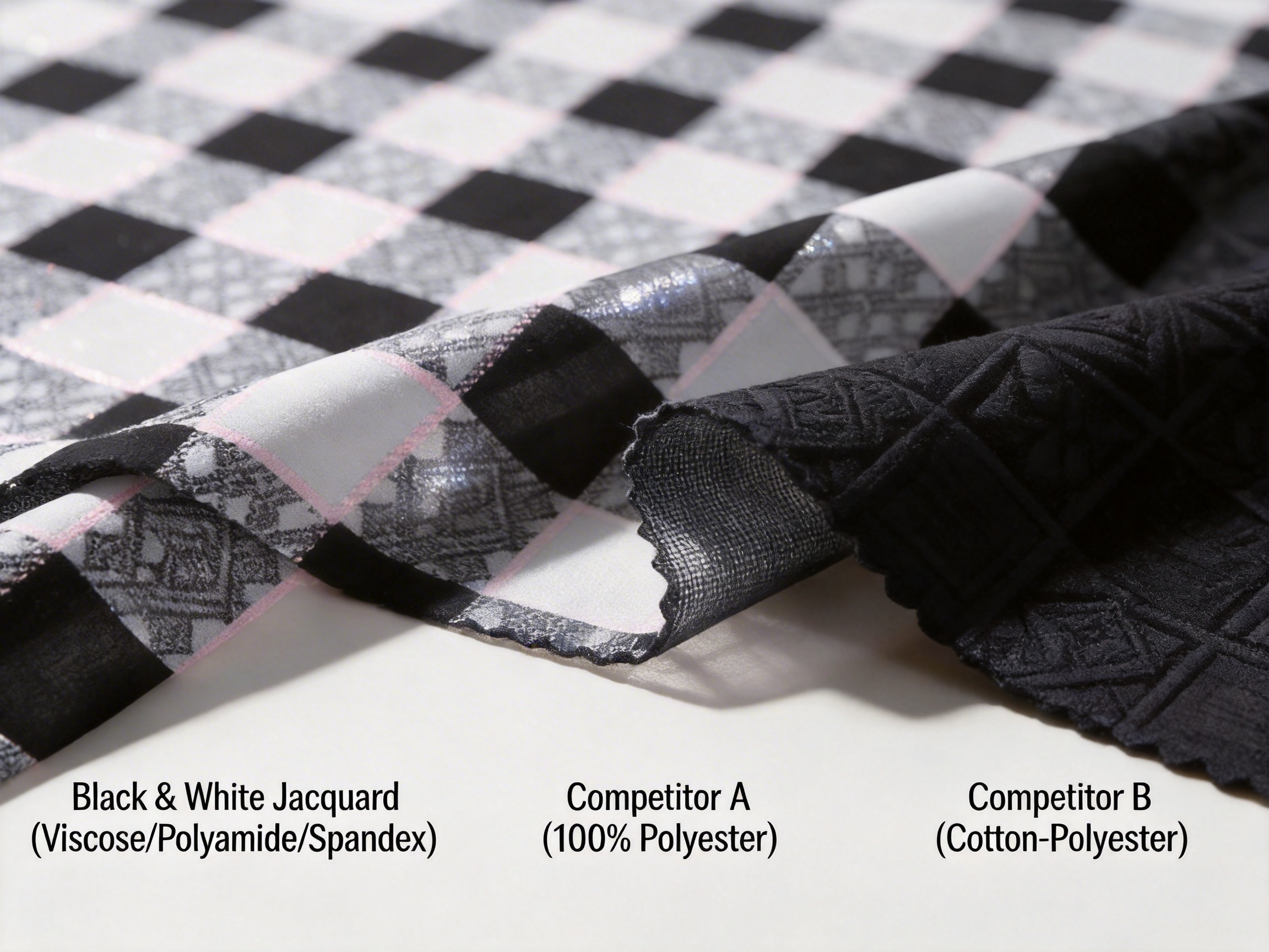 The Black And White Jacquard Pattern Fabric avoids these issues by combining viscose (softness), polyamide (durability), and spandex (stretch)—a blend that no major competitor offers in this exact configuration.