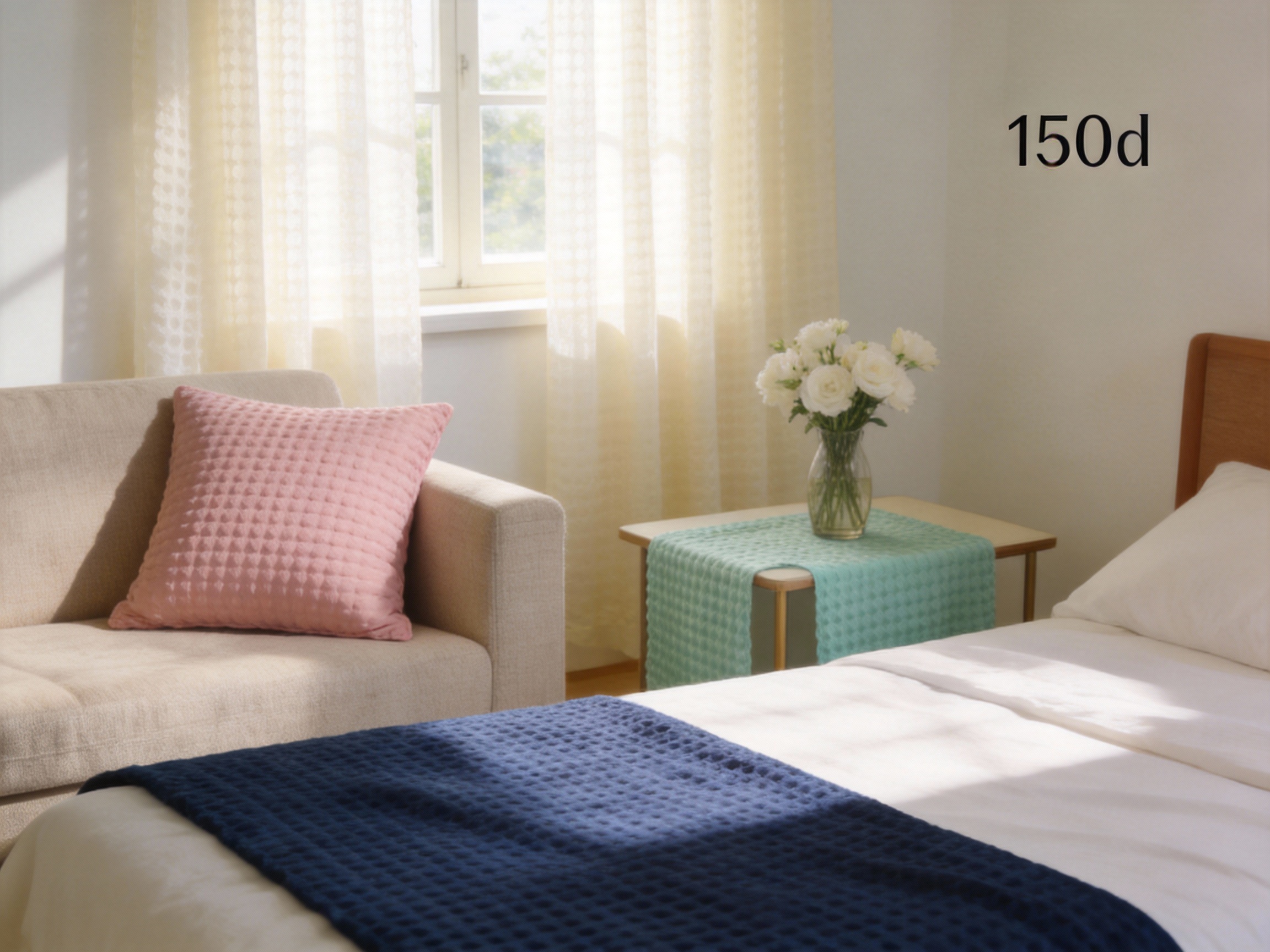 Bubble Fabric adds a touch of elegance to home spaces: - Curtains: Sheer curtains (50d) for light filtering, heavy curtains (150d) for privacy. The bubbly texture creates a cozy, inviting atmosphere. - Throw Pillows: Decorative pillows for sofas and beds—soft enough to lean on, vibrant enough to complement any decor. - Bed Runners: Luxurious bed runners for master bedrooms—adding a touch of sophistication to bedding. - Table Runners: Elegant table runners for dining tables—perfect for dinner parties and special occasions.