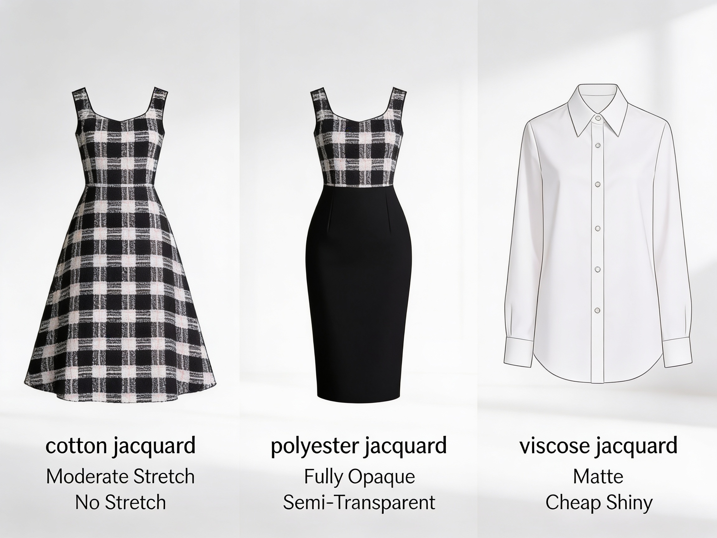 Single-Material Jacquards: Pure cotton jacquards are soft but lack stretch and may shrink; pure polyester jacquards are durable but can be scratchy and retain heat; pure viscose jacquards are lustrous but wrinkle easily and lack structure.