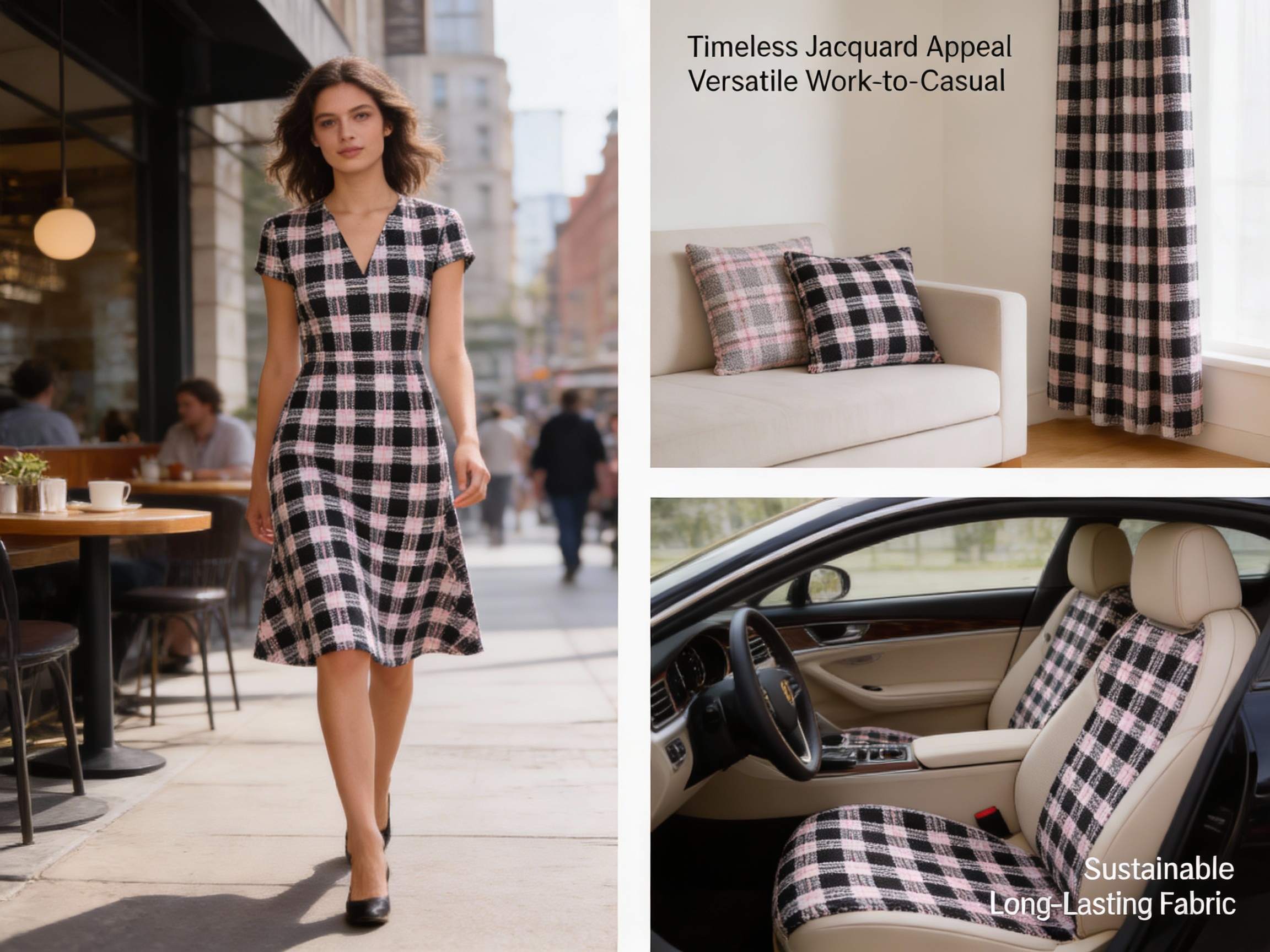 The fabric’s visual identity is defined by a bold black-and-white check pattern, but what sets it apart from generic jacquard fabrics is the subtle nuances in its design: