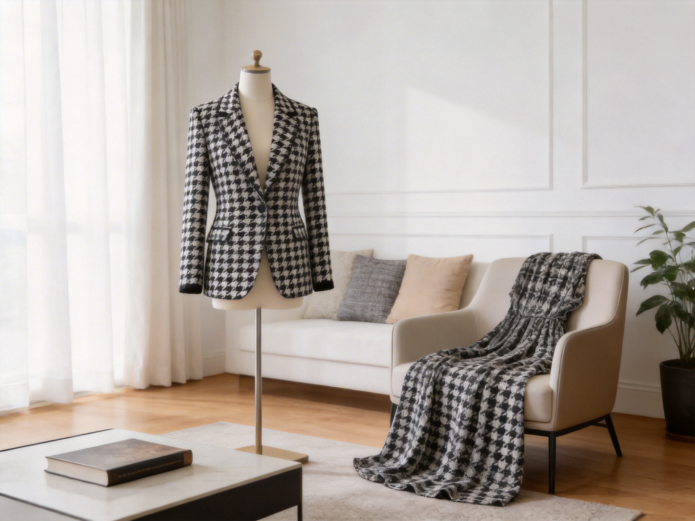 The knitted jacquard houndstooth fabric’s versatility is one of its most compelling features. It can be used in a wide range of applications, from high-end apparel to home textiles, making it a favorite among designers and consumers alike. For apparel, it’s perfect for: - Tailored blazers and coats: The pattern adds a touch of sophistication to formal wear, while the stretch ensures a comfortable fit. - Dresses and skirts: The fabric’s flowy nature and breathability make it ideal for feminine silhouettes. - Casual tops and sweaters: The softness and stretch make it great for everyday wear. For home textiles, the fabric works well for: - Curtains and drapes: The pattern adds visual interest to windows, while the fabric’s light weight allows it to hang beautifully. - Throw pillows and cushions: The houndstooth pattern complements a variety of interior design styles, from modern to classic. - Upholstery (light use): The fabric’s durability makes it suitable for accent chairs or ottomans in low-traffic areas.
