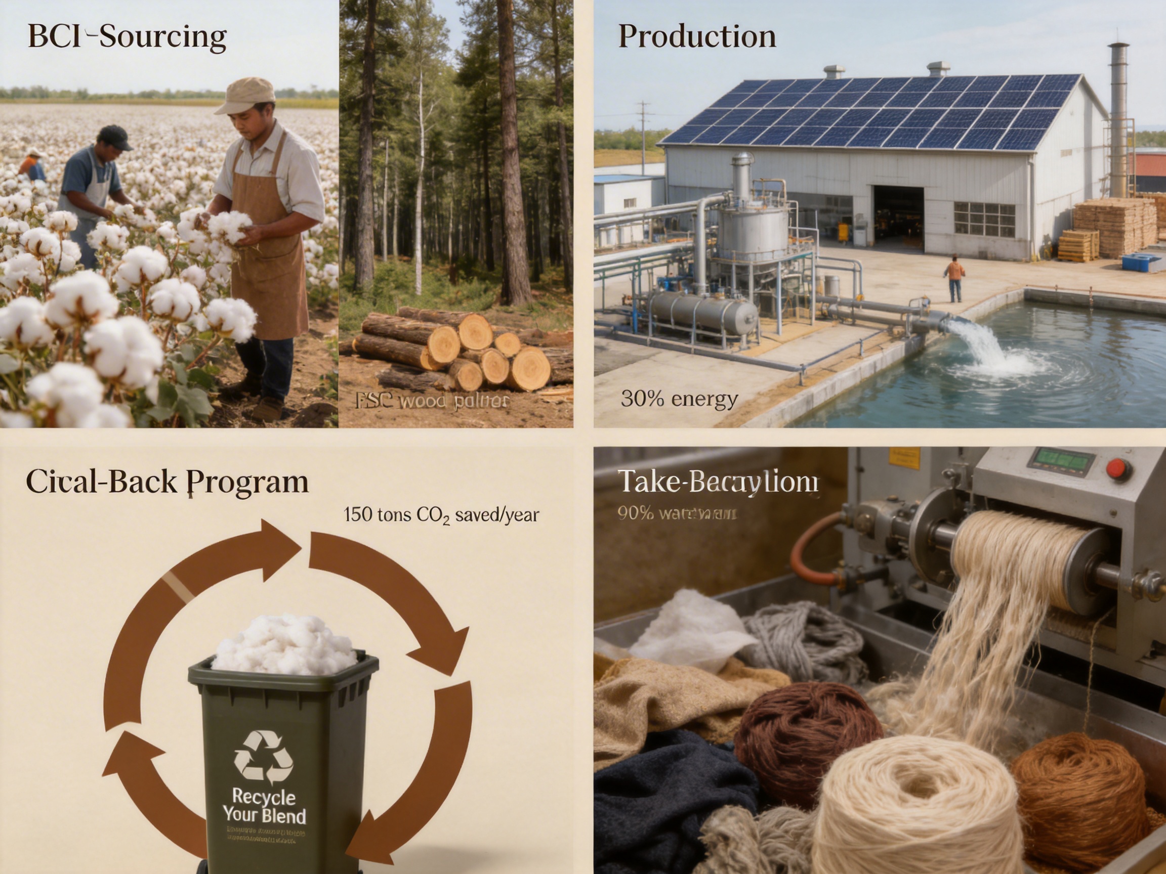 The fabric is recyclable: blended fibers are processed into new yarns. A take-back program collects old textiles (100 tons/year) for recycling, reducing landfill waste.