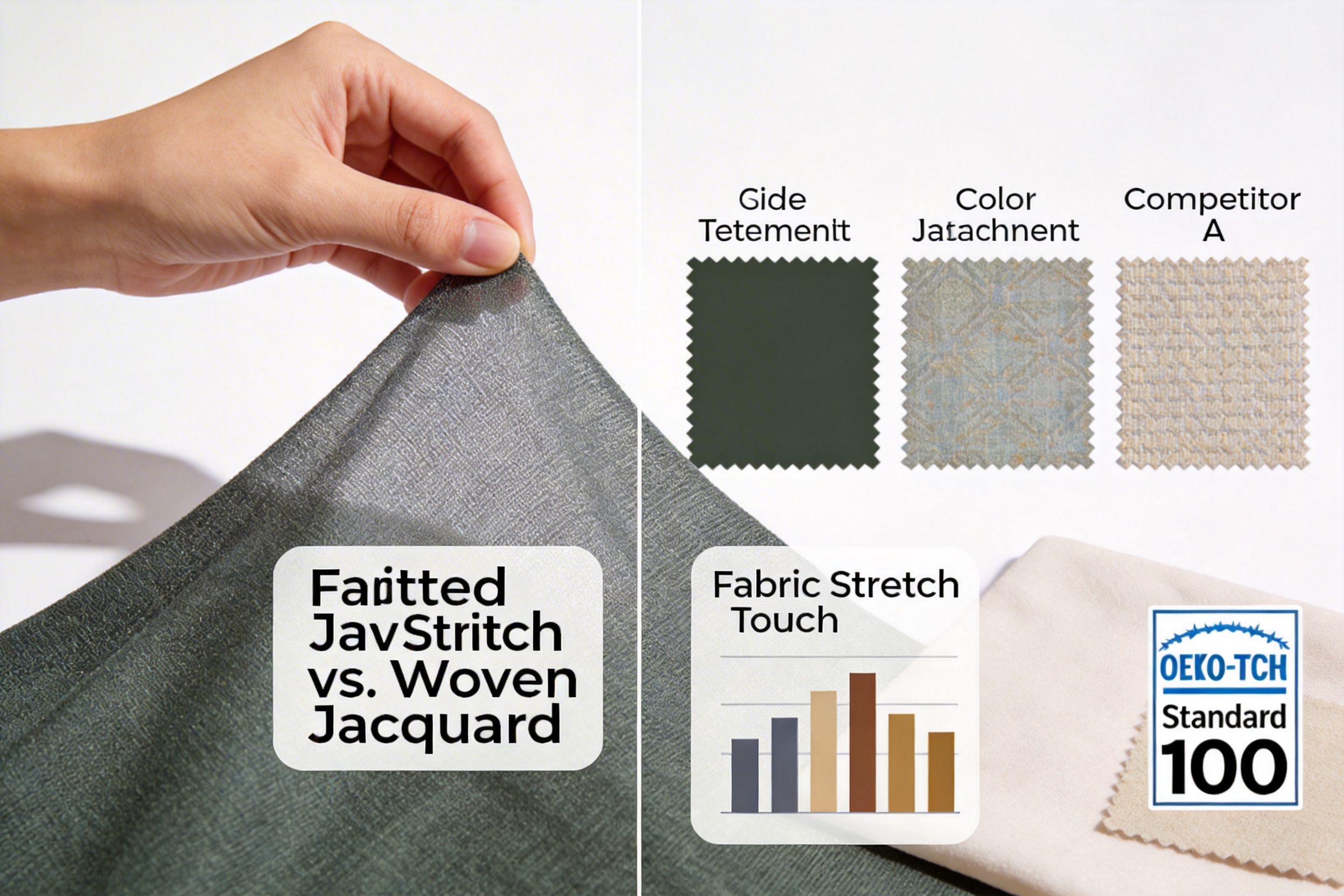 Competitive analysis reveals clear gaps: - Woven jacquard: Typically made from 100% polyester, it is heavy (300 GSM), non-stretchy, and prone to wrinkling. It also has a stiff handfeel that can irritate sensitive skin. - 100% viscose knit: While soft and drapey, it lacks strength and is prone to fading and tearing. - Competitor A’s knitted jacquard: A blend of 70% polyester, 25% viscose, and 5% spandex, it feels stiffer than the featured fabric and has lower color fastness due to conventional dyeing processes.