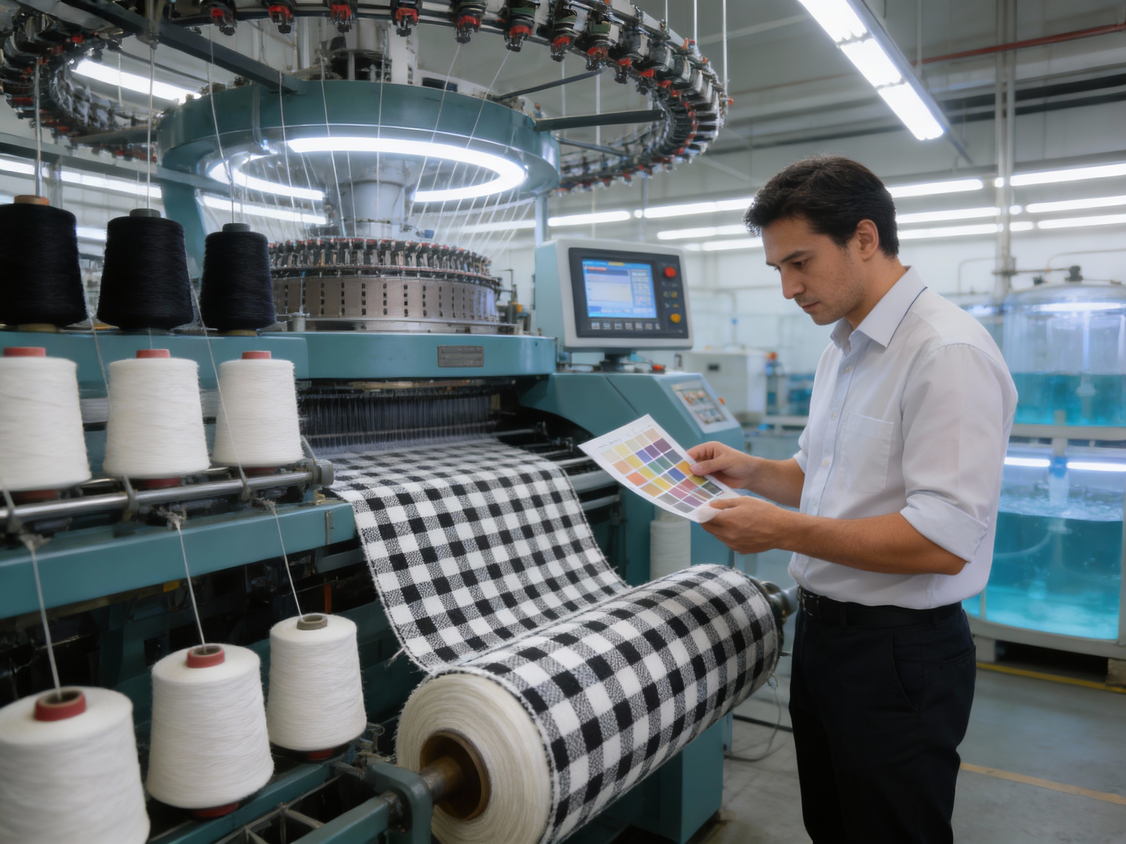 The process works like this: the machine uses a digital pattern file to control which needles are raised or lowered. For the black and white grid, the machine alternates between black and white DTY yarns, creating a seamless pattern that is integrated into the fabric’s structure. This eliminates the need for printing, which reduces waste and ensures the pattern never fades.