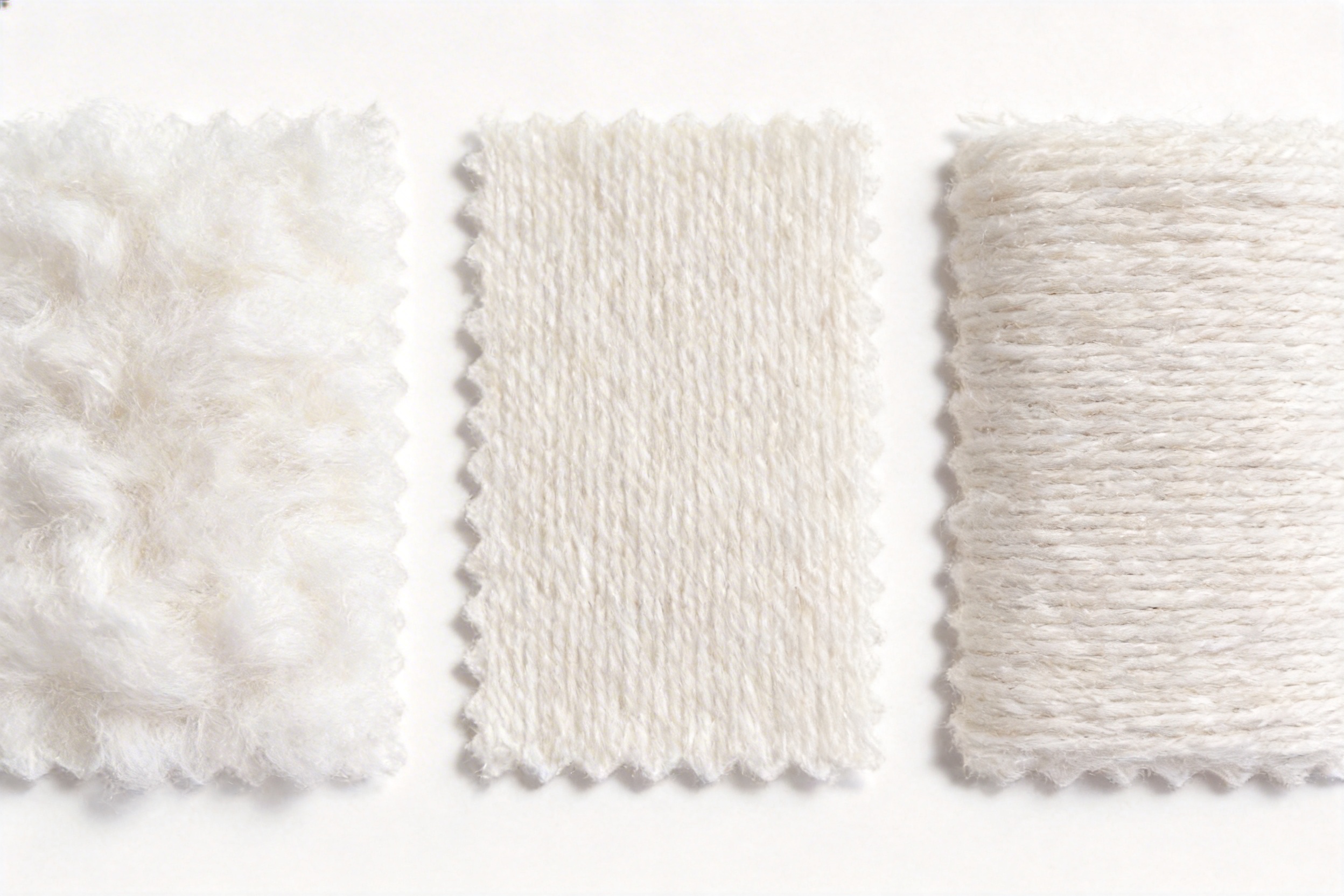Figure 2: Side-by-side comparison of fabrics made from White Slight Intermingled DTY (left), standard cotton (middle), and regular intermingled DTY (right). The DTY fabric shows superior bulk and texture.