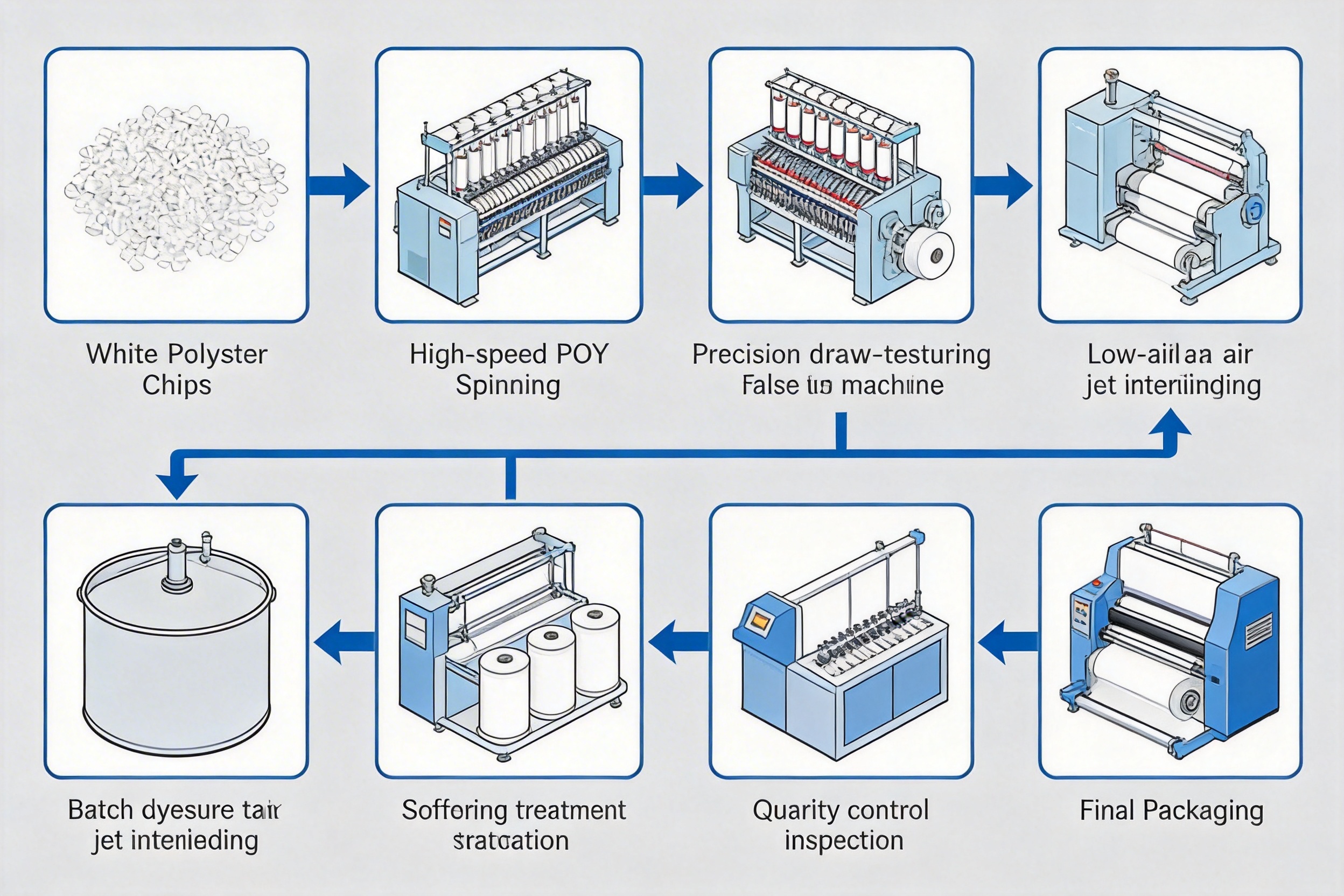 Figure 3: Flowchart of the White Slight Intermingled DTY production process, from POY spinning to final packaging.