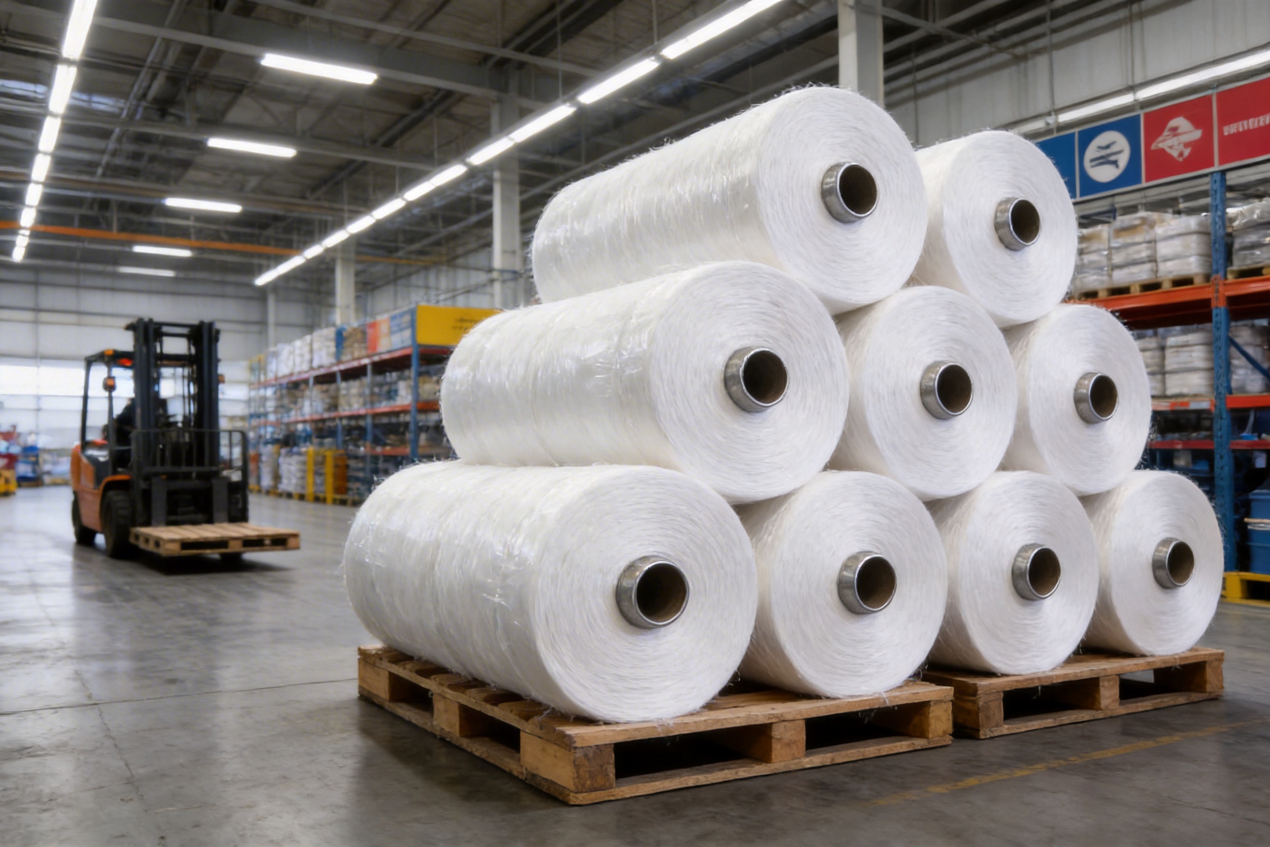 Figure 4: Warehouse with bulk rolls of White Slight Intermingled DTY, ready for export to global clients.